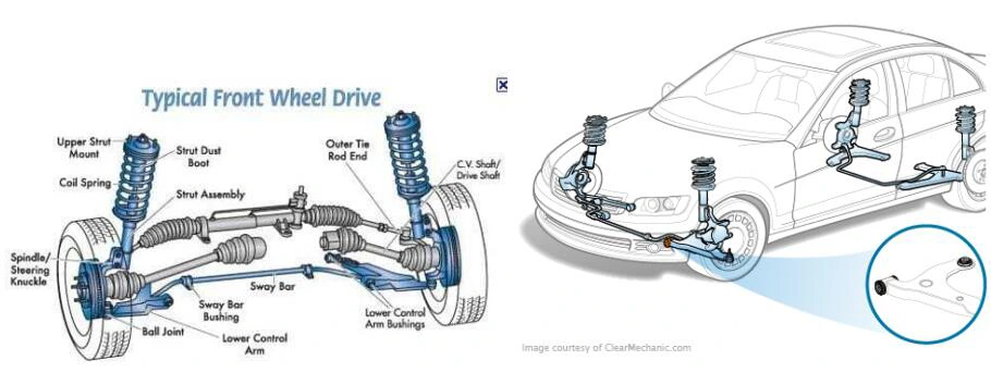 (Mga ilustrasyon at diagram na nagsasaad ng mga karaniwang posisyon ng bushing sa mga layout ng suspensyon.)