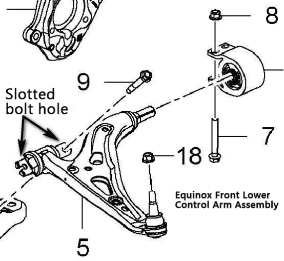 Ipinapakita ng larawan sa itaas ang front lower control arm assembly para sa Chevrolet Equinox. Ang arrow ay nagpapahiwatig ng open-bolt hole structure sa loob ng bushing assembly.