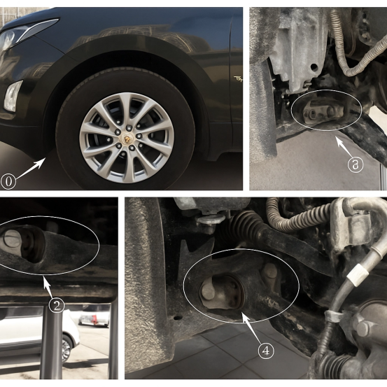 Ang nakaraang set ng mga larawan ay naglalarawan ng istrukturang kondisyon ng isang front suspension control arm bushing failure sa isang Chevrolet Equinox. Pinapayuhan nito ang mga user na, tulad ng ipinapakita sa diagram sa itaas, ang structural component na may potensyal na pagkabigo ay maaaring suriin sa pamamagitan ng pag-ikot ng manibela sa full lock sa posisyon ①. Ang pag-verify ng kaligtasan ng bushing assembly ay dapat isagawa sa pamamagitan ng mga litratong kinunan sa maraming lokasyon kabilang ang mga posisyon ②, , at ④.